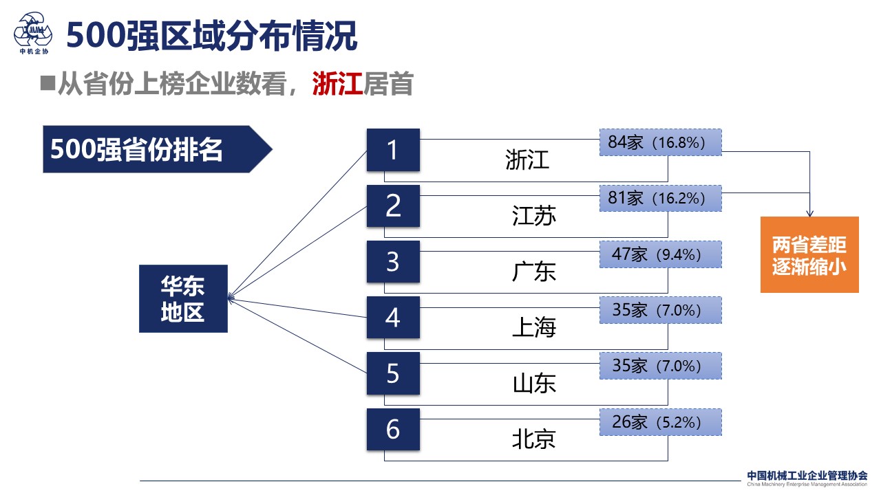 從500強(qiáng)上榜企業(yè)區(qū)域分布來看,全國有29個(gè)省份地區(qū)企業(yè)進(jìn)入榜單,浙江省、江蘇省仍然為上榜企業(yè)大省,分別有84家、81家企業(yè)入圍,同比兩省入榜企業(yè)數(shù)量差距逐漸縮小。