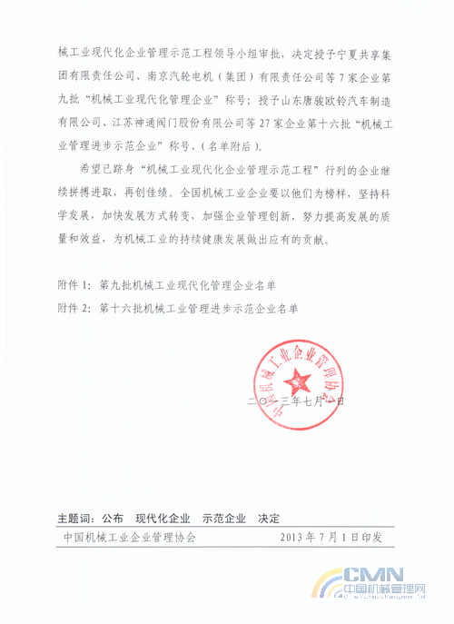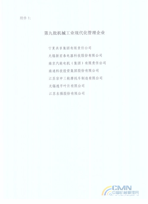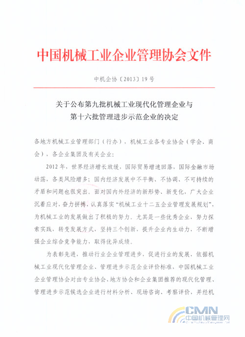 關(guān)于公布第九批機械工業(yè)現(xiàn)代化管理企業(yè)與第十六批管理進步示范企業(yè)的決定