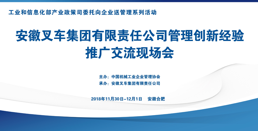 2018年11月29日-12月1日,工信部產(chǎn)業(yè)政策司委托中國機(jī)械工業(yè)企業(yè)管理協(xié)會(簡稱中機(jī)企協(xié))主辦、安徽叉車集團(tuán)有限責(zé)任公司(簡稱合力)承辦的機(jī)械行業(yè)“向企業(yè)送管理”現(xiàn)場交流活動(dòng)在安徽省合肥市隆重舉辦。工信部產(chǎn)業(yè)司產(chǎn)業(yè)組織處處長匡佩遠(yuǎn),趙薛憶,中機(jī)企協(xié)理事長孫伯淮,常務(wù)副理事長李玲,副理事長于中赤、張德進(jìn)、張愛群,以及來自機(jī)械行業(yè)的企業(yè)代表180余人參加了活動(dòng)。