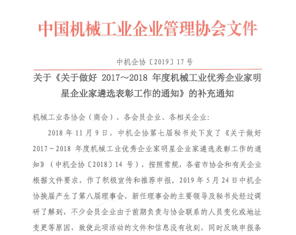關(guān)于做好2017~2018年度機(jī)械工業(yè)優(yōu)秀企業(yè)家明星企業(yè)家遴選表彰工作的補(bǔ)充通知