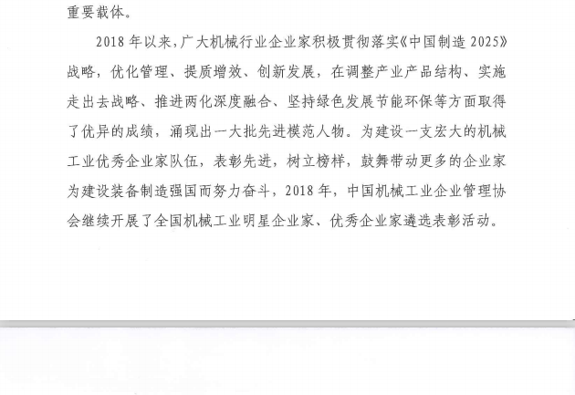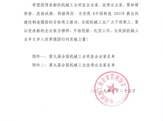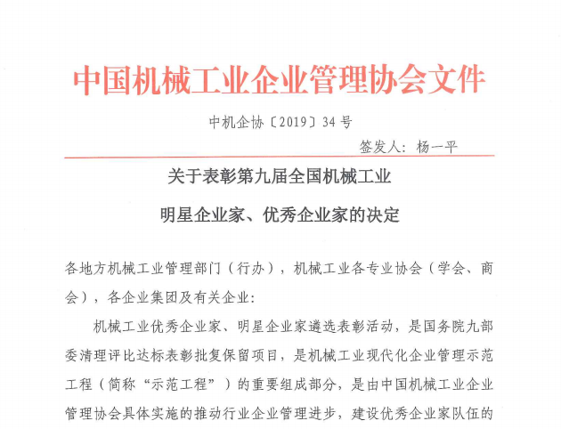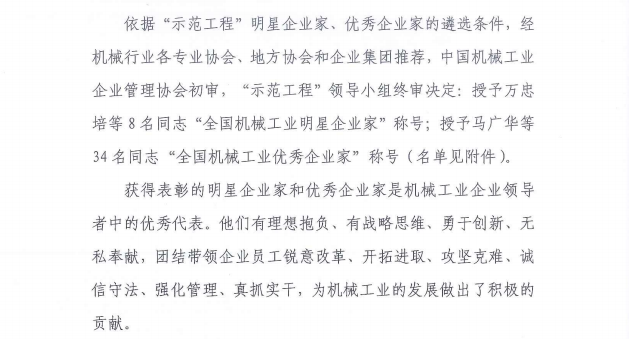 關(guān)于表彰第九屆全國機械工業(yè)明星企業(yè)家、優(yōu)秀企業(yè)家的決定